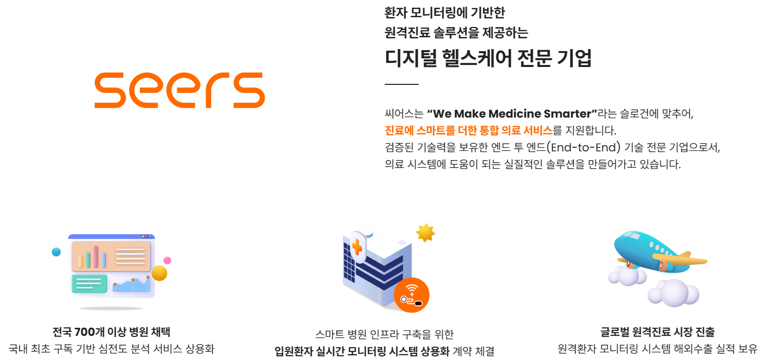 씨어스테크놀로지는 2009년에 설립되어 웨어러블 의료기기와 인공지능(AI) 기반의 디지털 헬스 솔루션을 제공하는 기업입니다. 2024년 코스닥 시장에 기술성장기업으로 상장했으며 We Make Medicine Smarter라는 슬로건 아래 질병 관리의 공백을 해소하는 통합 의료 서비스를 목표로 하고 있습니다.