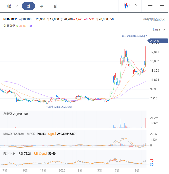 NHN KCP는 대한민국의 대표적인 전자결제 전문 기업으로 온라인 결제대행(PG)과 가치부가네트워크(VAN) 서비스를 주력으로 하는 NHN 그룹 산하 회사입니다. 1994년 설립 이후 국내 전자결제 시장의 선두주자로 성장하며 2024년 매출 1조 원 클럽에 최초로 가입한 PG사로서 안정적인 성장을 이어가고 있습니다. 2025년 들어 스테이블코인 관련 기대감과 신사업 확대로 주가가 급등하는 등 활발한 움직임을 보이고 있습니다.