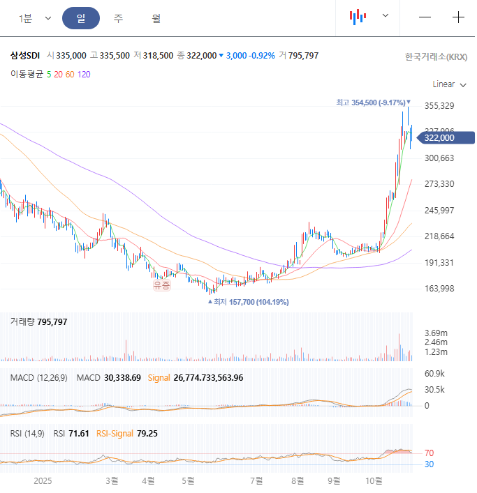 삼성SDI는 삼성그룹의 핵심 계열사 중 하나로 첨단 에너지 솔루션과 전자 소재 분야에서 세계적인 리더로 자리 잡은 기업입니다. 주로 리튬이온 배터리와 같은 2차 전지, 에너지 저장 시스템(ESS), 전자재료를 개발·생산하며 전기자동차(EV), IT 기기, 재생 에너지 분야에서 필수적인 역할을 수행합니다. 글로벌 배터리 시장의 치열한 경쟁 속에서 기술 혁신을 통해 반등의 기회를 모색하고 있으며 최근 테슬라와의 대규모 ESS 배터리 공급 계약과 CES 2026 혁신상 수상 등 긍정적인 소식을 전하고 있습니다.
